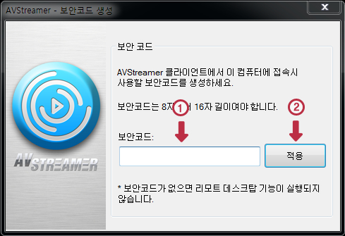 보안코드는 AVStreamer를 이용하기 위해서는 필수적으로 입력해야 합니다.